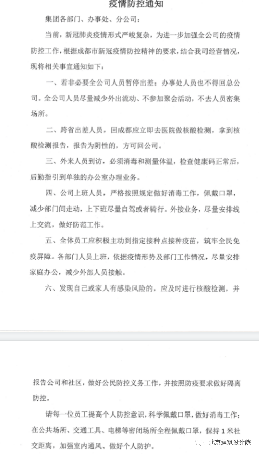 按照疫情防控相关要求,通知强调了每日的消毒,减少和避免外出,从外地出差回来要及时做核酸检测,合格后方能进入公司办公。公司在此呼吁所有客户近期尽量不要前往成都总部;如有计划前往的客户希望能延后出行计划;对急需现场沟通的客户,集团公司董事长朱生伟、书记赵勇、总经理龚禹、副总经理曾凡珂均全日制在岗工作,客户可在线视频对话任何一位领导来完成项目沟通和合作的相关事项,以此来降低疫情风险扩散可能。